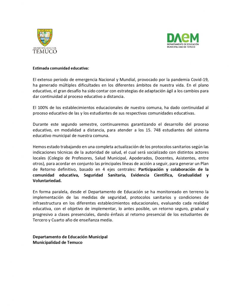 Estimada Comunidad Educativa, compartimos con ustedes el comunicado oficial del Departamento de Educación Municipal de Temuco (DAEM), respecto de la situación actual y el inicio del segundo semestre año 2021.